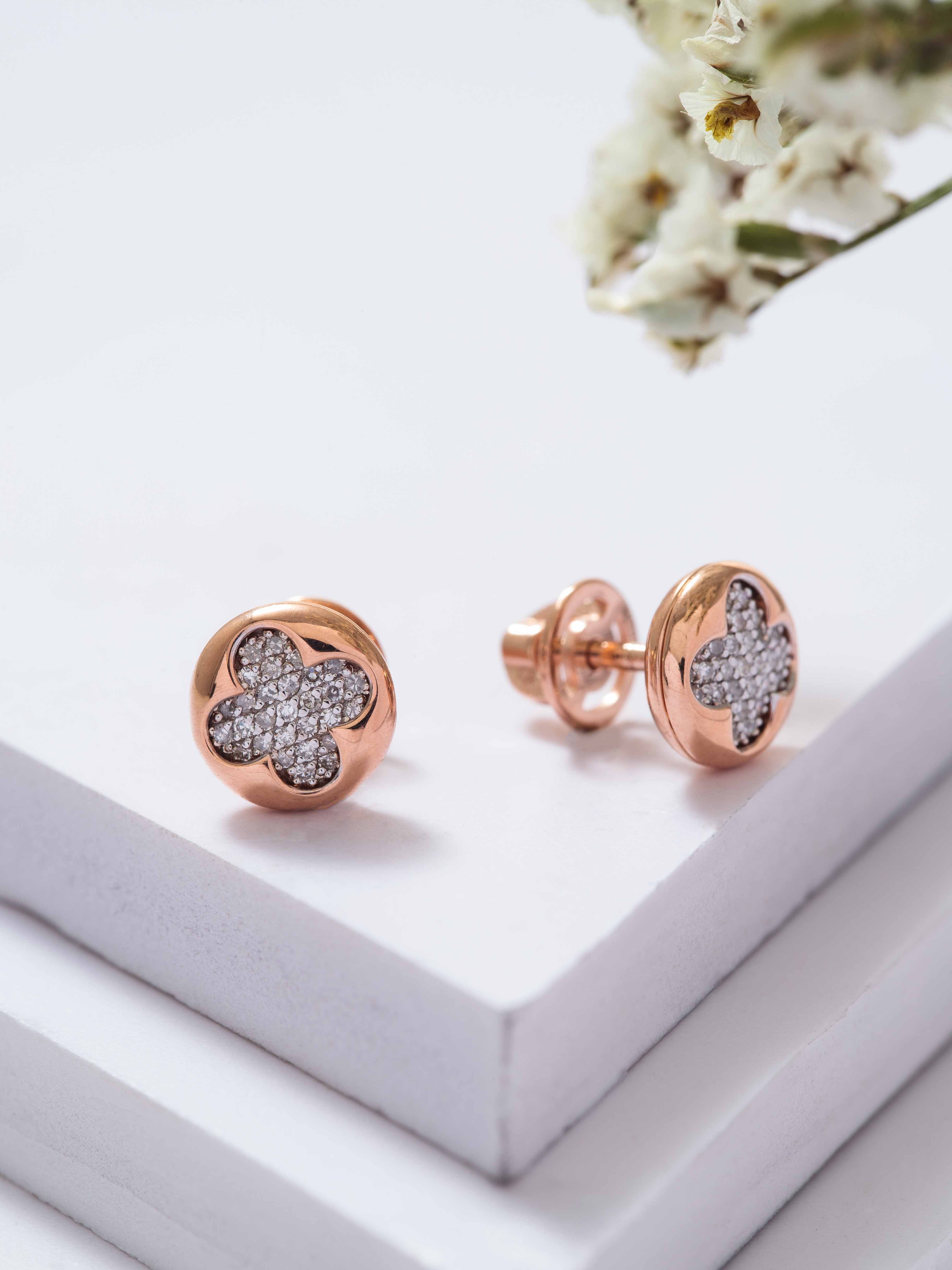 Нежные серьги-пусеты, выполненные из благородного красного и белого золота 585 пробы, украшены россыпью сверкающих бриллиантов, которые создают очаровательную игру света