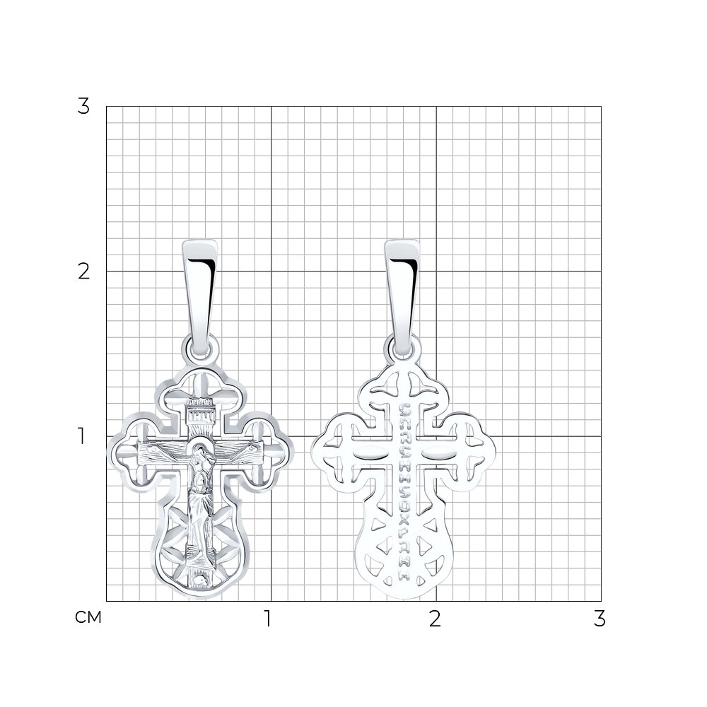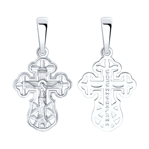 Ажурная подвеска в виде нательного креста выполнена из белого золота 585 пробы. Крест соответствует всем канонам Православной церкви, на внешней стороне - распятие, на обороте надпись "Спаси и сохрани". Украшение дополнительно покрыто родием - металл платиновой группы, который защищает золото от внешних воздействий и придает искрящийся яркий блеск. Изделие представлено брендом "SOKOLOV". В комплект поставки входит: