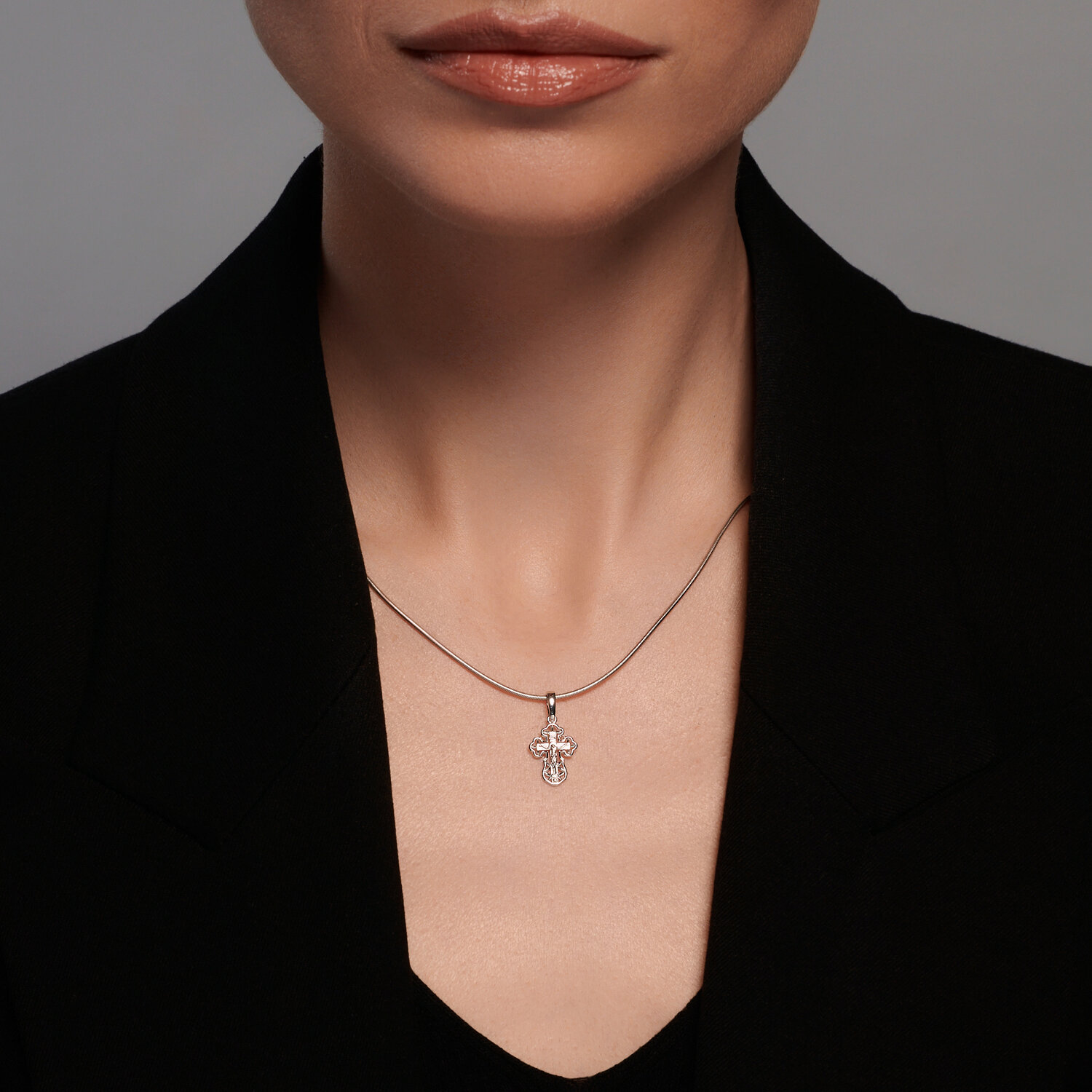 Ажурная подвеска в виде нательного креста выполнена из белого золота 585 пробы