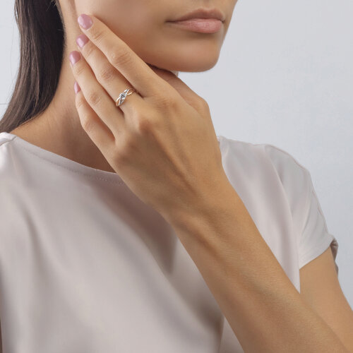 Кольцо с сияющим фианитом выполнено из красного и белого золота 585 пробы