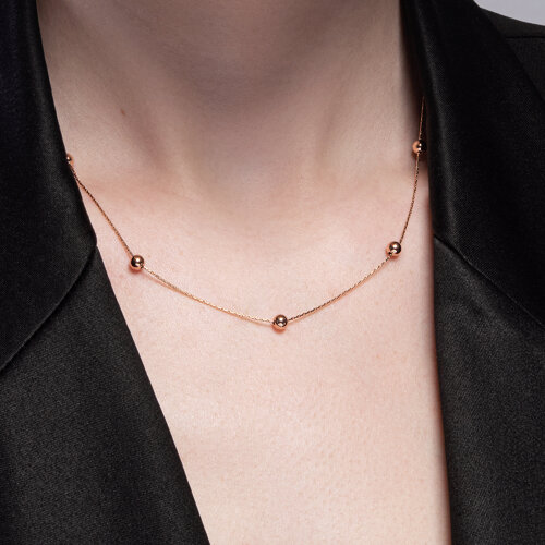 Цепочное колье, украшенное изящными вставками в виде шариков, выполнено из красного золота 585 пробы