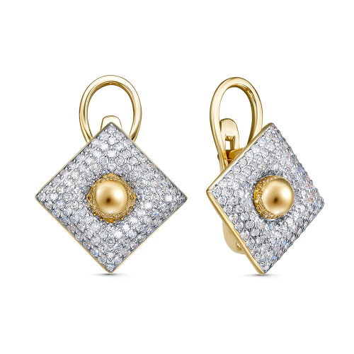 Элегантные серьги выполнены из благородного сочетания желтого и белого золота 585 пробы, украшенные сверкающими белыми и коньячными бриллиантами