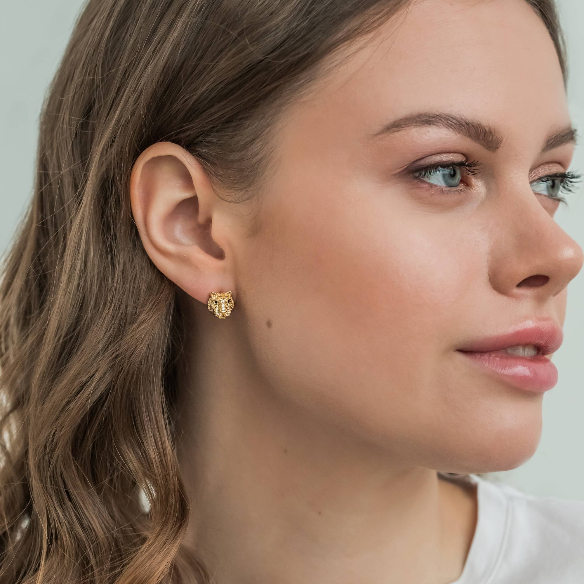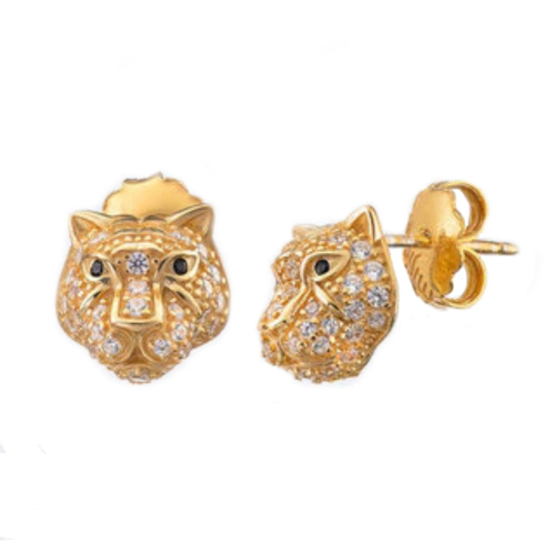 Стильные серьги-пусеты в анималистическом стиле выполнены из серебра 925 пробы с покрытием желтым золотом и украшенный черно-белыми фианитами