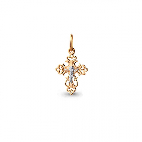 Миниатюрный православный крест для ребенка, выполнен в сочетании красного и белого золота 585 пробы, в нем исполнены все каноны Православной Церкви, на внешней стороне креста распятие, на обороте надпись "спаси и сохрани"