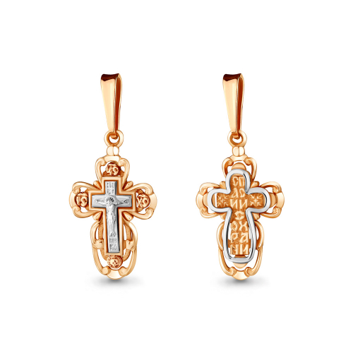 Ажурный крест, в котором исполнены все каноны Православной Церкви, выполнен в сочетании красного и белого золота 585 пробы.