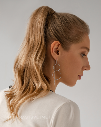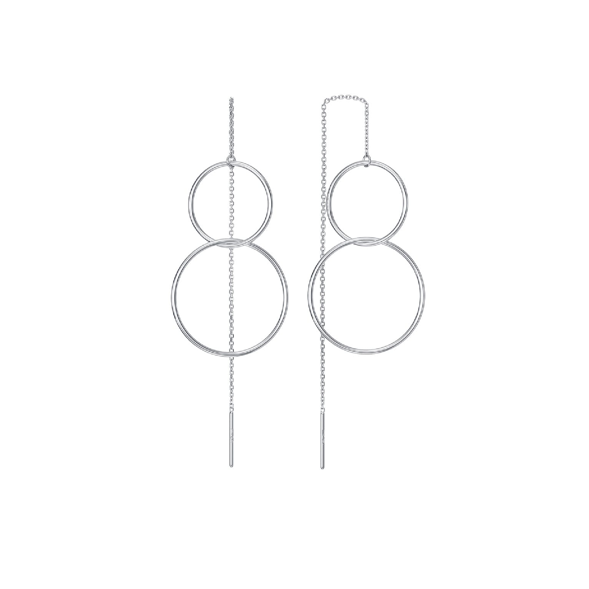 Элегантные серьги-протяжки с подвесной частью в виде колец выполнены из родированного серебра 925 пробы