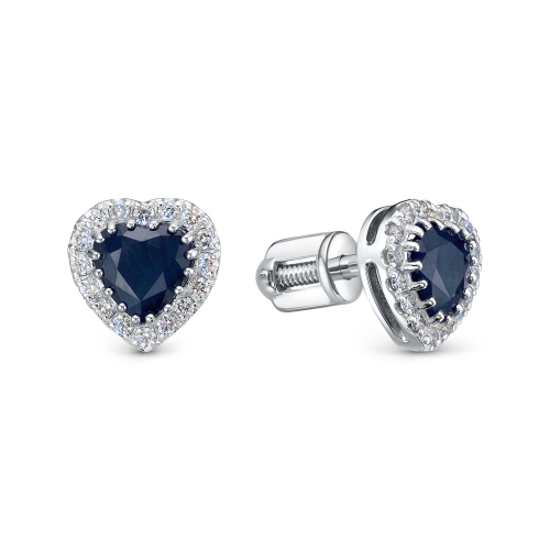 Символичные и очень нежные серьги-пусеты выполнены из белого золота 585 пробы в виде сердец, украшены великолепными сапфирами сияющими бриллиантами