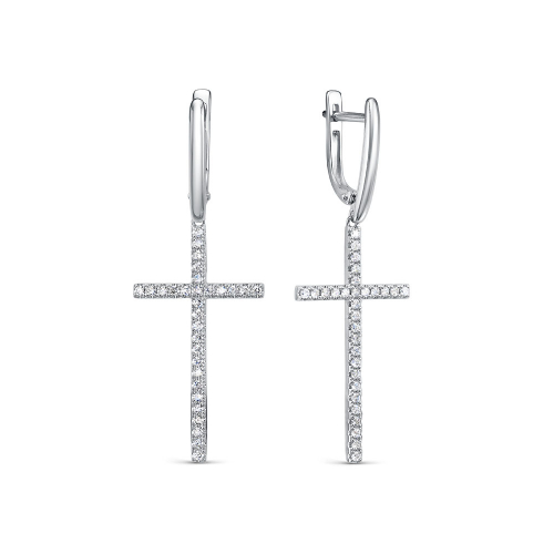 Стильные удлинённые серьги с подвесками в виде декоративных крестов, украшенных дорожками бриллиантов, выполнены из белого золота 585 пробы. Такое украшение идеально впишется в повседневный образ, подчеркнув вашу красоту и элегантность.