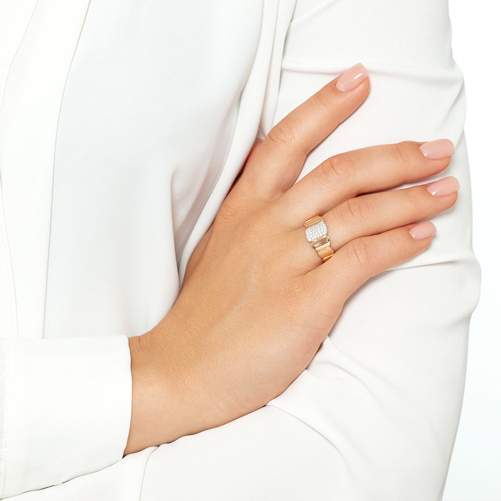 Роскошное кольцо привлекает внимание необычным сочетанием цветов и смелым дизайном. Выполнено оно из комбинации красного и белого золота 585 пробы, что создает эффект игры света и тени. Поверхность кольца украшена фианитами, придающими ему дополнительный блеск и шик. Такое изделие станет ярким акцентом в вашем образе и привлечёт восхищённые взгляды окружающих. Представлено брендом ROSE GRACE. Средняя характеристика камней: 33 Фианит Кр 1,00 В комплект поставки входит: