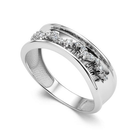 Стильное кольцо, украшенное дорожкой сверкающих бриллиантов, выполнено из белого золота 585 пробы