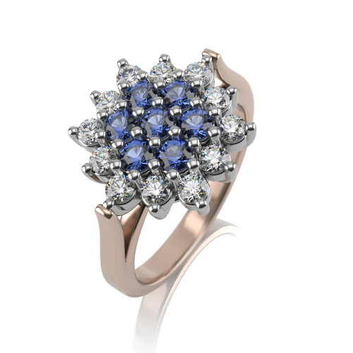 Роскошное кольцо из красного и белого золота 585 пробы с драгоценными камнями, натуральными сапфирами и бриллиантами.