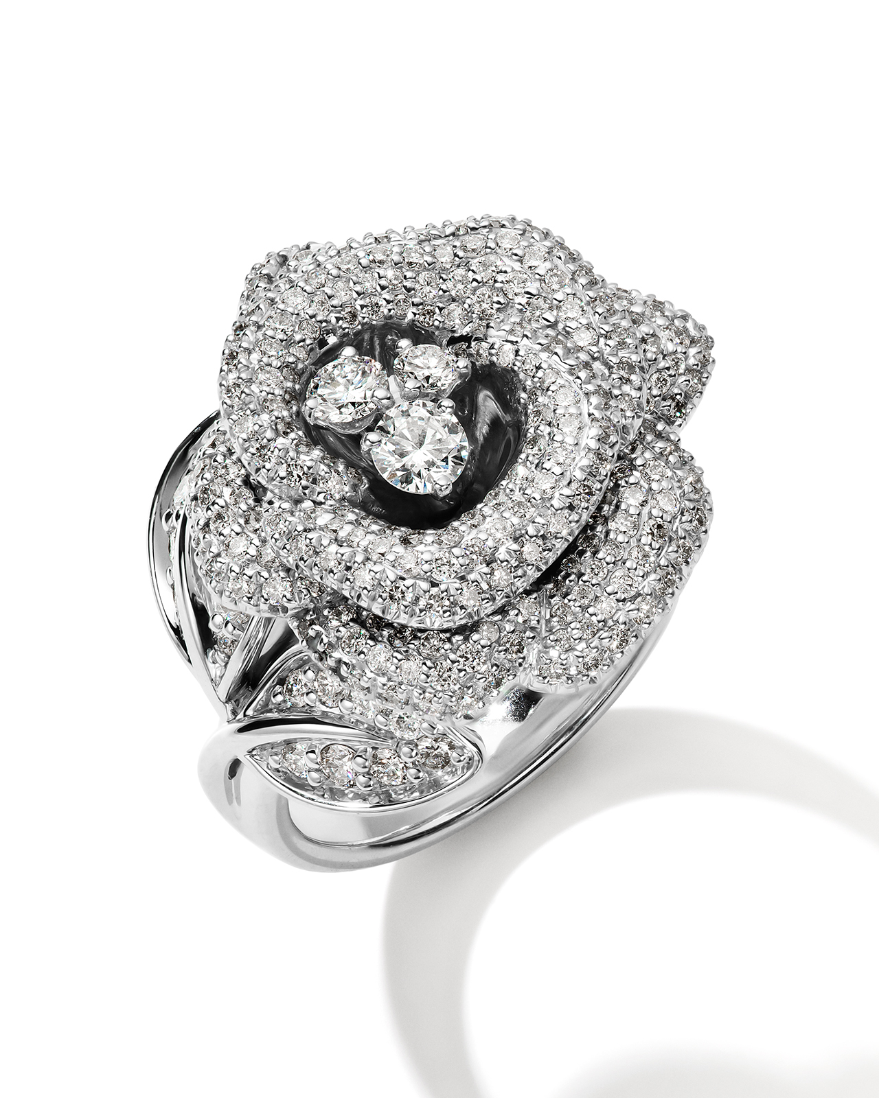 Роскошное кольцо в виде розы, инкрустированной сверкающими бриллиантами, выполнено из белого золота 585 пробы