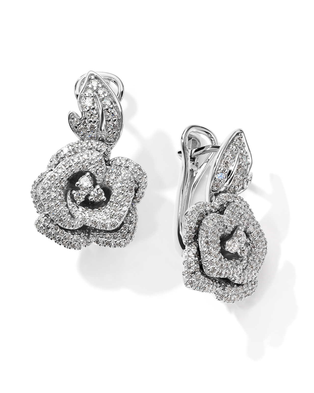 Роскошные серьги в виде розы, инкрустированной сверкающими бриллиантами, выполнены из белого золота 585 пробы