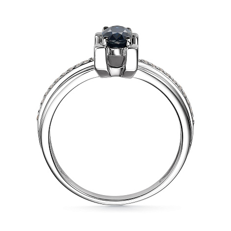 Изящное кольцо, украшенное сапфиром, красоту и насыщенный цвет которого подчёркивает дорожка бриллиантов, выполнено из белого золота 585 пробы