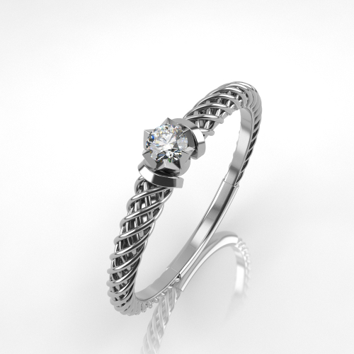 Стильное кольцо выполнено из белого золота 585 пробы, украшено великолепным искрящимся бриллиантом, и отличается уникальной рельефной обработкой поверхности.
