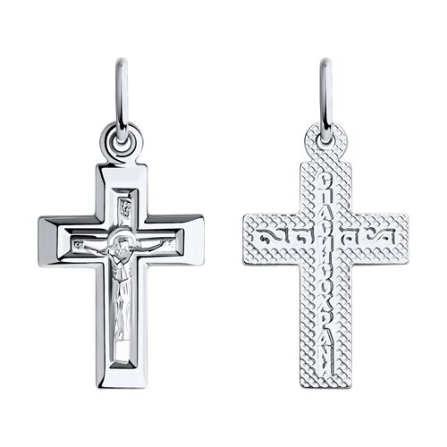 Православный крест, в котором исполнены все каноны Православной Церкви, выполнен из белого золота 585 пробы. На оборотной стороне надпись "Спаси и сохрани". Изделие представлено брендом SOKOLOV. В комплект поставки входит: