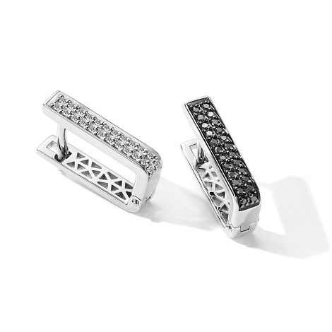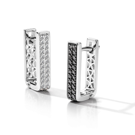 Аккуратные серьги выполнены из белого золота 585 пробы, украшены великолепными дорожками чёрных и бесцветных сияющих бриллиантов