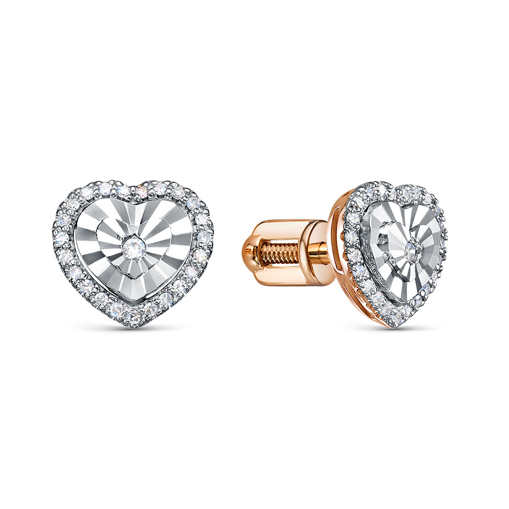 Серьги-пусеты в форм сердца с бриллиантом в центре, блеск и красоту которого усиливают бриллианты меньшего размера, выполнены с сочетанием красного и белого золота 585 пробы