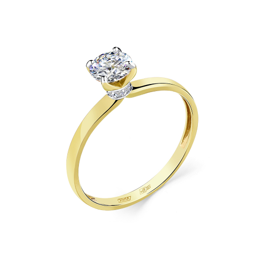 Кольцо с сверкающим фианитом в касте, подчёркнутым дорожкой фианитов, выполнено из желтого и белого золота 585 пробы