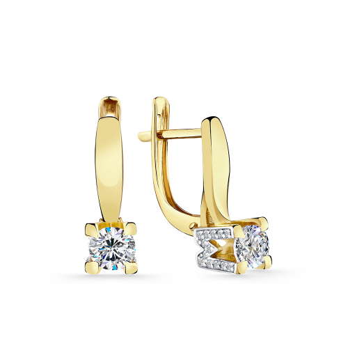Серьги с крупным фианитом, блеск и красоту которого подчёркивают дорожки меньших по размеру фианитов, выполнены с сочетанием желтого и белого золота 585 пробы