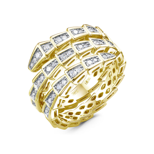 Объёмное и стильное кольцо с оригинальным дизайном выполнено из жёлтого и белого золота 585 пробы, украшено сверкающими бриллиантами