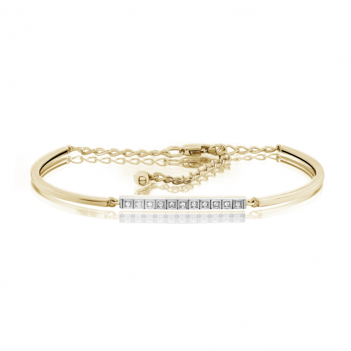 Элегантный женский жёсткий браслет с сверкающими бриллиантами, выполнен с сочетанием жёлтого и белого золота 585 пробы. Драгоценный металл красиво блестит как в искусственном, так и в естественном свете, а камни играют собственными гранями, дополняя визуальный эффект. Размер браслета регулируется за счёт изящной цепочной вставки. Изделие представлено брендом KABAROVSKY. Средняя характеристика камней на артикул : 11 Бр Кр-17 0.042ct; К украшению прилагается сертификат от производителя о подлинности драгоценных камней. В комплект поставки входит: