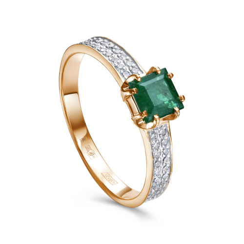 Изящное кольцо из красного золота 585 пробы украшено благородным изумрудом и сверкающими бриллиантами