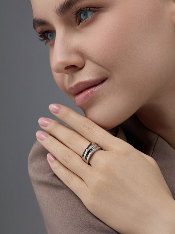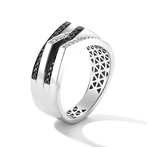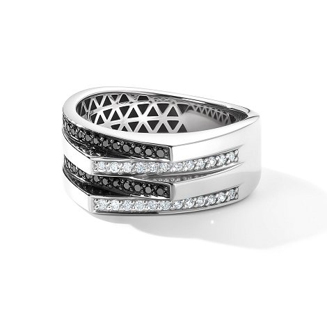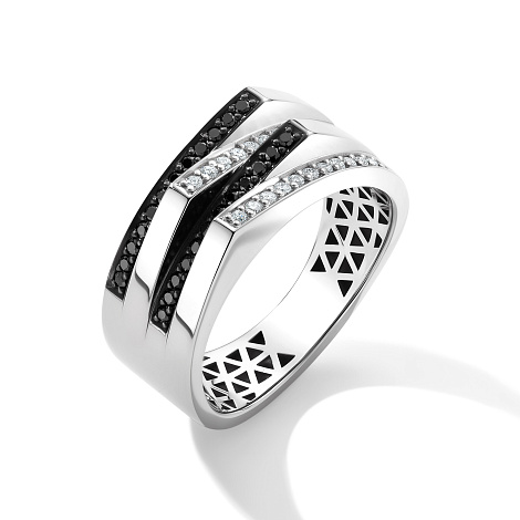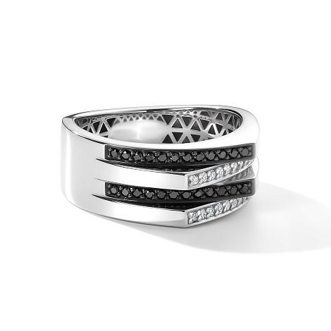 Кольцо из белого золота 585 пробы, украшенное контрастным сочетанием черных и белых бриллиантов, производит сильное впечатление