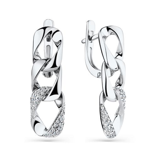 Роскошные удлинённые серьги выполнены из белого золота 585 пробы, украшены великолепными сияющими бриллиантами. Блеск благородного металла в сочетании с сияющими бриллиантами, привлекают внимание с первого вгляда. Огранка камней максимально раскрывает их красоту, а оправа позволяет лучам света играть на их поверхности, делая их ещё более искристыми. Дизайн украшения универсально подходит к какому угодно образу и способен изящно завершить любой наряд. Тип замка - английский, самый надежный и удобный. Изделие представлено брендом MASTER BRILLIANT. Средняя характеристика камней на артикул: 56 Бр Круг 0,224.
