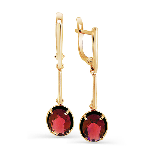 Удлинённые серьги с подвесной частью, украшенной натуральными гранатами круглой формы, выполнены из красного золота 585 пробы