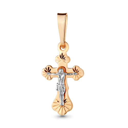 Миниатюрный православный крест выполнен в сочетании красного и белого золота 585 пробы, в нем исполнены все каноны православной церкви, на внешней стороне креста распятие, на обороте надпись "спаси и сохрани"