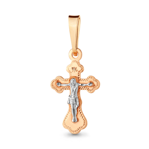 Миниатюрный православный крест выполнен в сочетании красного и белого золота 585 пробы, в нем исполнены все каноны Православной Церкви, на внешней стороне креста распятие, на обороте надпись "спаси и сохрани".