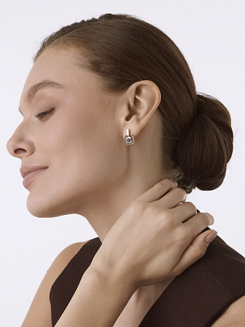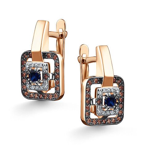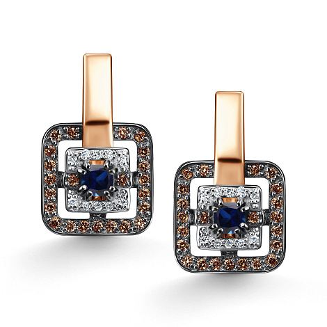 Роскошные серьги из красного золота 585 пробы с глубоким синим сапфиром, окружённым коньячными и чёрными бриллиантами. Эффектное сочетание тёплых и холодных оттенков придаёт украшению современный характер, а надёжный английский замок обеспечивает комфорт и безопасность. Представлено брендом АЛЬКОР. Средняя характеристика камней: 20 Бриллиант Круг 17 0.068 2/3, 46 Бриллиант Круг 57 0.265 7/6 коньяк, 2 Сапфир Квадрат 0.43 2/2 В комплект поставки входит: