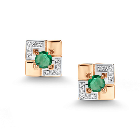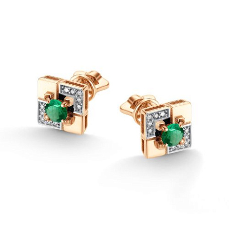 Изысканные серьги-пусеты из красного и белого золота 585 пробы, украшенные изумрудами и бриллиантами