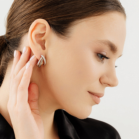 Роскошные серьги итальянского дизайна из коллекции Fettuccine, выполнены из красного и белого золота 585 пробы, украшены сияющими дорожками великолепных бесцветных бриллиантов и искрящихся бриллиантов коньячного цвета. Переливы двух оттенков золота в сочетании с драгоценными камнями, привлекают внимание с первого вгляда. Огранка камней максимально раскрывает их красоту, а оправа позволяет лучам света играть на их поверхности, делая их ещё более искристыми. Тип замка - английский, самый надежный и удобный. Изделие представлено брендом АЛЬКОР. К украшению прилагается сертификат от производителя о подлинности драгоценных камней. Средняя характеристика камней на артикул: 80 Бриллиант Круг 57 0.428 4/5, 74 Бриллиант Круг 57 0.468 7/6 коньяк.