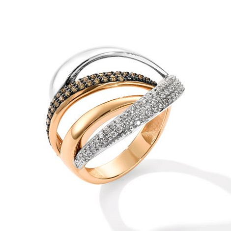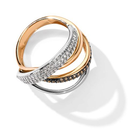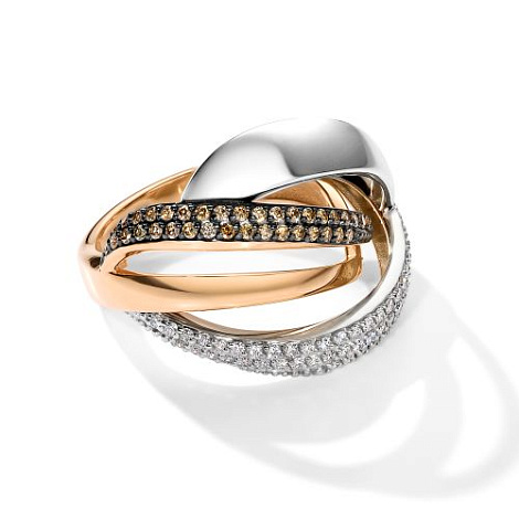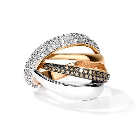 Роскошное кольцо итальянского дизайна из коллекции Fettuccine, выполнено в сочетании красного и белого золота 585 пробы, украшено сияющими дорожками безцветных бриллиантов и искрящихся бриллиантов коньячного цвета