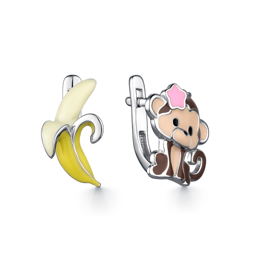 Очень милые и нежные ассиметричные серьги из серебра 925 пробы, украшены ювелирной эмалью в виде обезьянок. Яркая ювелирная эмаль всегда будет привлекать восторженные взгляды подружек. Тип замка - английский, самый надежный и удобный. Изделие представлено брендом "DEWI". В комплект поставки входит: