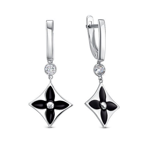 Современные серьги с подвесной частью флористического дизайна выполнены из серебра 925 пробы в сочетании с черной эмалью