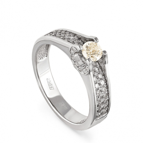 Изящное кольцо из белого золота 585 пробы с центральным бриллиантом цвета шампань, окружённым сверкающими белыми бриллиантами