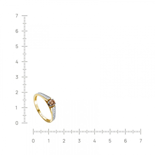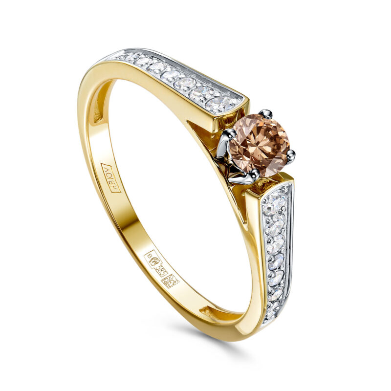 Элегантное кольцо из лимонного золота 585 пробы с центральным бриллиантом цвета шампань, окружённым россыпью белых бриллиантов