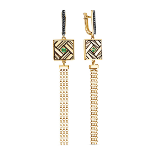 Серьги из серебра 925 пробы с изумрудом, чёрными фианитами и холодной эмалью от российского бренда Kabarovsky — это воплощение современного ювелирного искусства. Подвесная часть в виде объёмного квадрата с позолотой придаёт украшению выразительность и стиль. Яркая холодная эмаль, глубокий зелёный оттенок изумруда и таинственный блеск чёрных фианитов создают гармоничный и запоминающийся образ. Эти серьги станут эффектным акцентом как для повседневного, так и для вечернего наряда, подчеркнув индивидуальность и хороший вкус своей обладательницы.Средняя характеристика камней: 20 Фианит Круг 1,25|2 Изумруд Круг 3,00 3/3 0.192ct В комплект поставки входит: