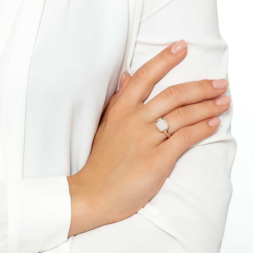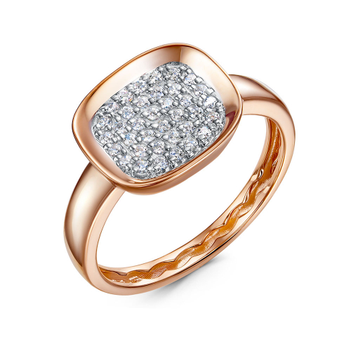 Кольцо из красного золота с центральной частью, украшенной россыпью фианитов, — это элегантное и универсальное украшение