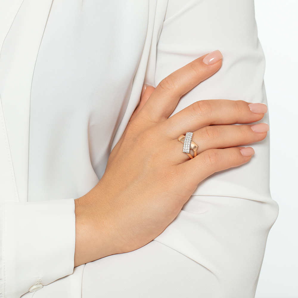 Кольцо из красного золота — воплощение современного стиля и элегантности. Его широкая перекрёстная шинка создаёт интересный графичный узор, а по центру, словно застывшая река света, проходит роскошная дорожка из сверкающих фианитов. Украшение привлекает внимание игрой золота и блеском камней, подчёркивая индивидуальность и вкус своей обладательницы. В комплект поставки входит: