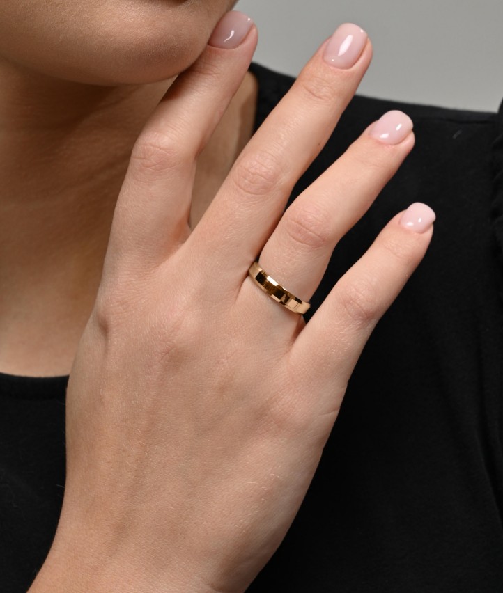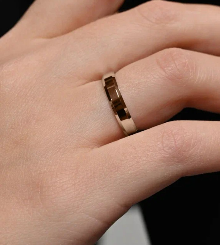 Полновесное обручальное кольцо с прямым профилем "шайба", выполнено из красного золота 585 пробы, особую оригинальность кольцу придают скошенные края в сочетании с идеально гладкой поверхностью кольца