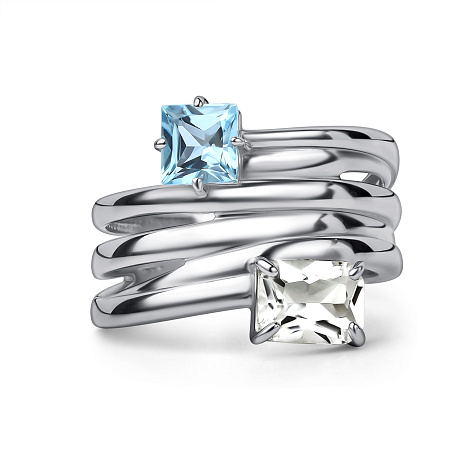 Элегантное кольцо из серебра 925 пробы с топазом Sky и горным хрусталём. Нежно-голубой оттенок топаза в сочетании с прозрачностью хрусталя создаёт утончённый и воздушный образ. Представлено брендом АЛЬКОР. Средняя характеристика камней: 1 Горный хрусталь Белый Октагон 0,794, 1 Топаз Sky Blue Голубой Квадрат 0,778 В комплект поставки входит: